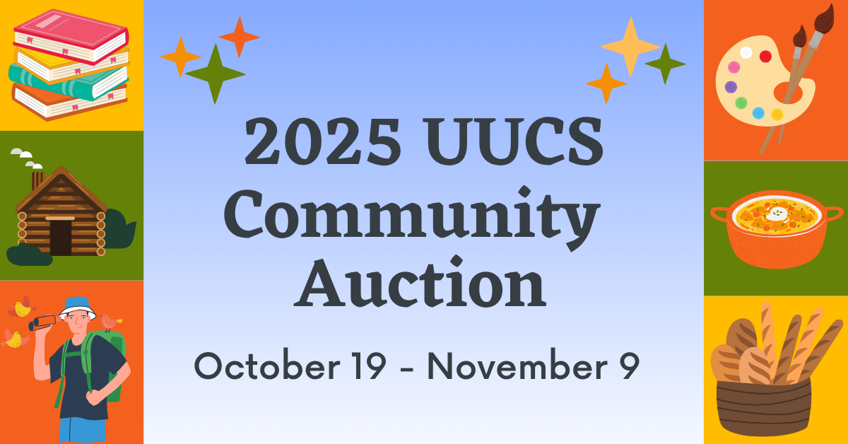 *To pay for your auction items, please include your name and “AUCTION” on your payment. You can either mail a check to UUCS, including “Auction” on the memo line, or use our online payment system by clicking HERE. Enter your payment total at the top, the first dropdown select “Give to Community Auction”, click continue, the second page enter your payment details, your name and AUCTION in the comments, then click the Give button.