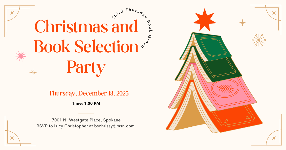 The Third Thursday Book Group is having a Christmas and Book Selection party! We will meet at the home of Lucy Christopher, 7001 N. Westgate Place. Bring a wrapped used book for our book exchange and if you wish one or two suggestions for next year’s book group reading list.